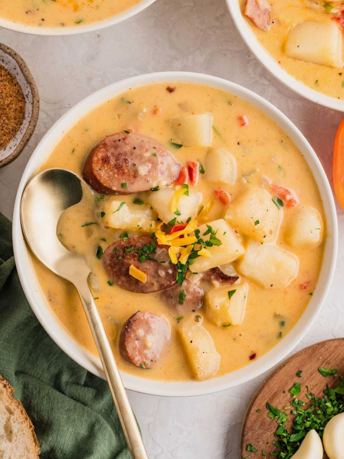 - Southern Comfort Food: cheddar cheese and heavy cream give this potato soup with sausage an ultra creamy texture that makes it incredibly satisfying.