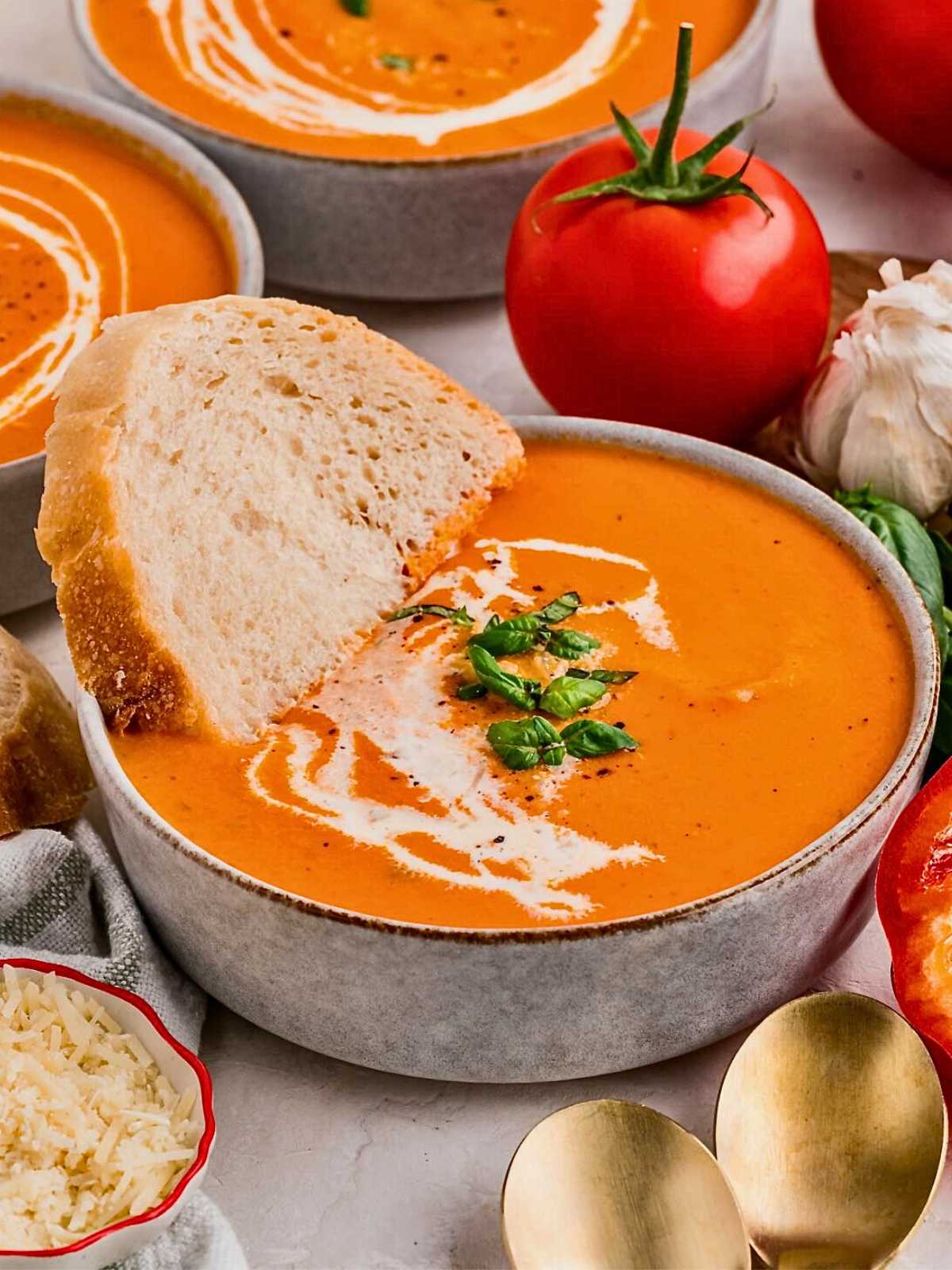 - Taste and adjust seasoning as needed. Pour into bowls and drizzle extra cream on top of soup. Garnish with fresh basil and red pepper flakes if desired.